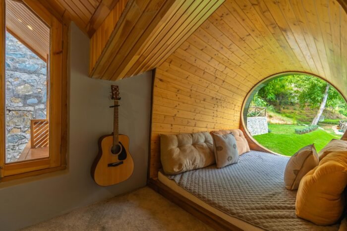 - Exteriors with a slanting roof and interiors decorated with handpicked wooden embellishments